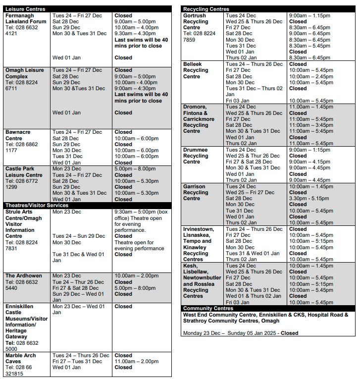 For further information on opening hours of all Council facilities, including recycling centres and leisure centres, during this time, please click here.