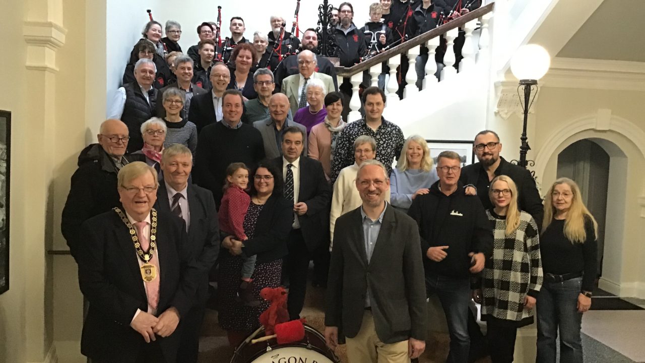 As Vice Chair of Fermanagh and Omagh District Council, I am delighted to welcome you all to The Townhall, Enniskillen this evening for this reception to welcome our visitors from Bielefeld (Beel-a-felt) and the Highland Dragon Pipe Band. I extend a particularly warm welcome to the District Mayor, Jesco von Kuczkawski, and Head of the Municipal District, Hans Georg Hellermann.
