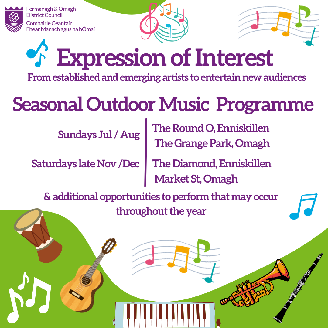 Fermanagh & Omagh District Council is inviting Expressions of Interest from local musicians established and new emerging talent to participate in its Seasonal Outdoor Music Programme and other opportunities to perform that may arise throughout the year. The programme presents a fantastic opportunity for both established and emerging artists to showcase their skills and entertain new audiences.