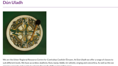 We are the Ulster Regional Resource Centre for Comhaltas Ceoltóirí Éireann. At Dún Uladh we offer a range of classes to suit different levels. We have accordion, bodhrán, flute, banjo, fiddle, tin-whistle, singing and concertina. As well as this we organise concerts and events to cater to the needs of the surrounding areas.