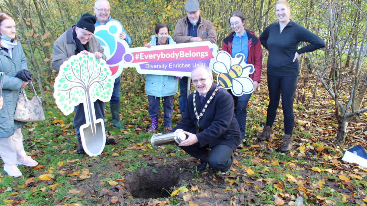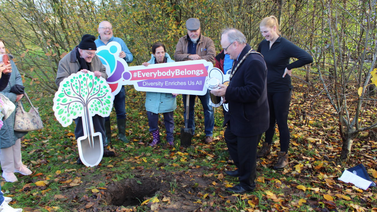 The trees were planted in the diversity garden in St Julian’s Park, Omagh members of Fermanagh and Omagh Interfaith Group and local volunteers assisted by Council Officers. Following the tree planting a time capsule, which contains artefacts from a variety of faiths and cultures in the district, was buried and it is intended that it will be opened in 100 years-time.